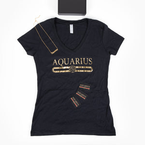 Add some glittering sex-appeal to your birthday night out look with the Aquarius Gold G-Girl Gift Box. Both the V-neck and Tank top will give you a stunning V-neckline with our without sleeves. The reflective metallic lettering pulls the whole look together and ensures that all eyes will be on you! This gift set includes a beautiful Old English Aquarius necklace and a set of Aquarius stickers.