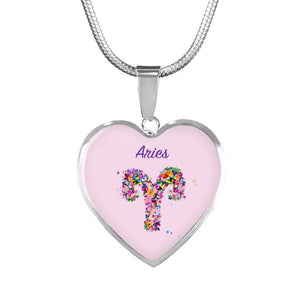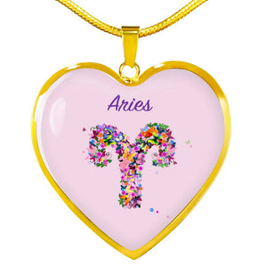 This delightful heart-shaped pendant necklace shows just how independent the Aries heart is! This necklace features the Aries sign in flowers and Aries written in a delicate script.