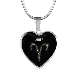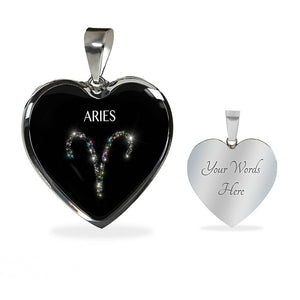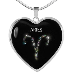 This delightful heart-shaped pendant necklace shows just how confident the Aries heart is! This necklace features the Aries sign illuminated in cosmic sparkles against a sleek black background.