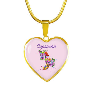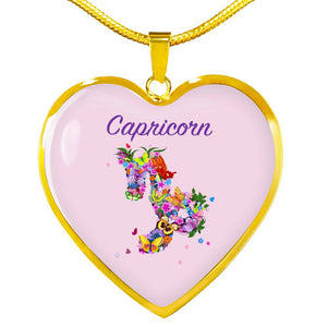 This delightful heart-shaped pendant necklace shows just how wise the Capricorn heart is! This necklace features the Capricorn sign in flowers and Capricorn written in a delicate script.