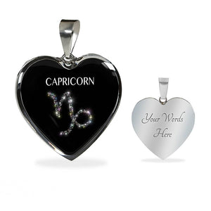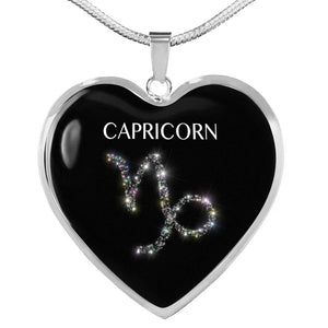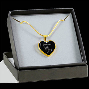 This delightful heart-shaped pendant necklace shows how willful the Capricorn heart is! This gold tone necklace features the Capricorn sign illuminated in cosmic sparkles against a sleek black background.