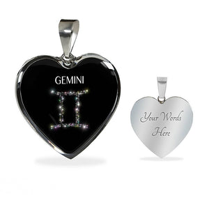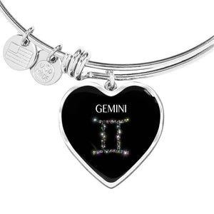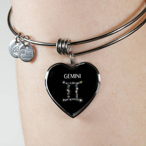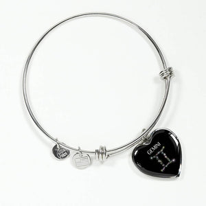 Sweeten up your day with this delightful Gemini bangle bracelet. This bangle features a sleek, heart shaped charm with the Gemini sign in luminous starbursts against a black background with two smaller charms to compliment.