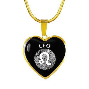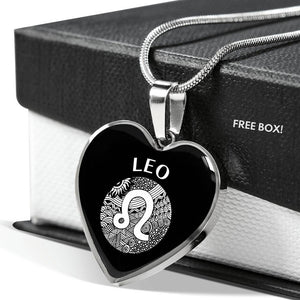 Leos have a heart of gold and now you can show it with this beautiful heart shaped pendant! This necklace features a unique and eye catching circle pattern with the Leo sign in white that pops against a sleek black background.