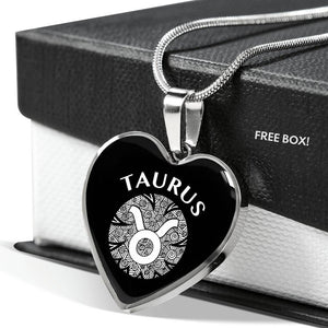 Taurus have a heart of gold and now you can show it with this beautiful heart- shaped pendant! This necklace features a unique and eye-catching circle pattern with the Taurus sign in white that pops against a sleek black background.