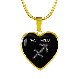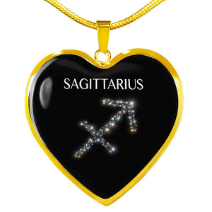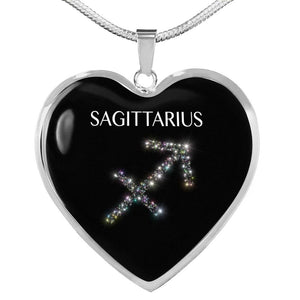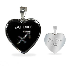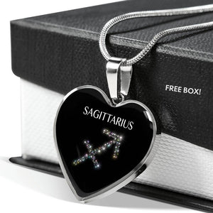 This delightful heart shaped pendant necklace shows how fun-loving the Sagittarius heart is! This necklace features the Sagittarius sign illuminated in cosmic sparkles against a sleek black background.